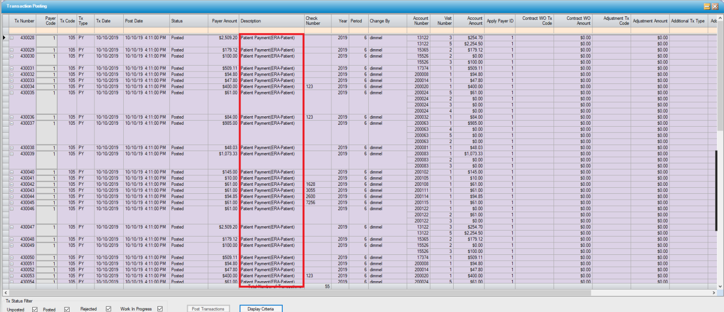 Transactions can be reviewed, edited, and posted individually via Payments and Adjustments (depending upon user permissions) or posted in bulk via Transaction Posting.