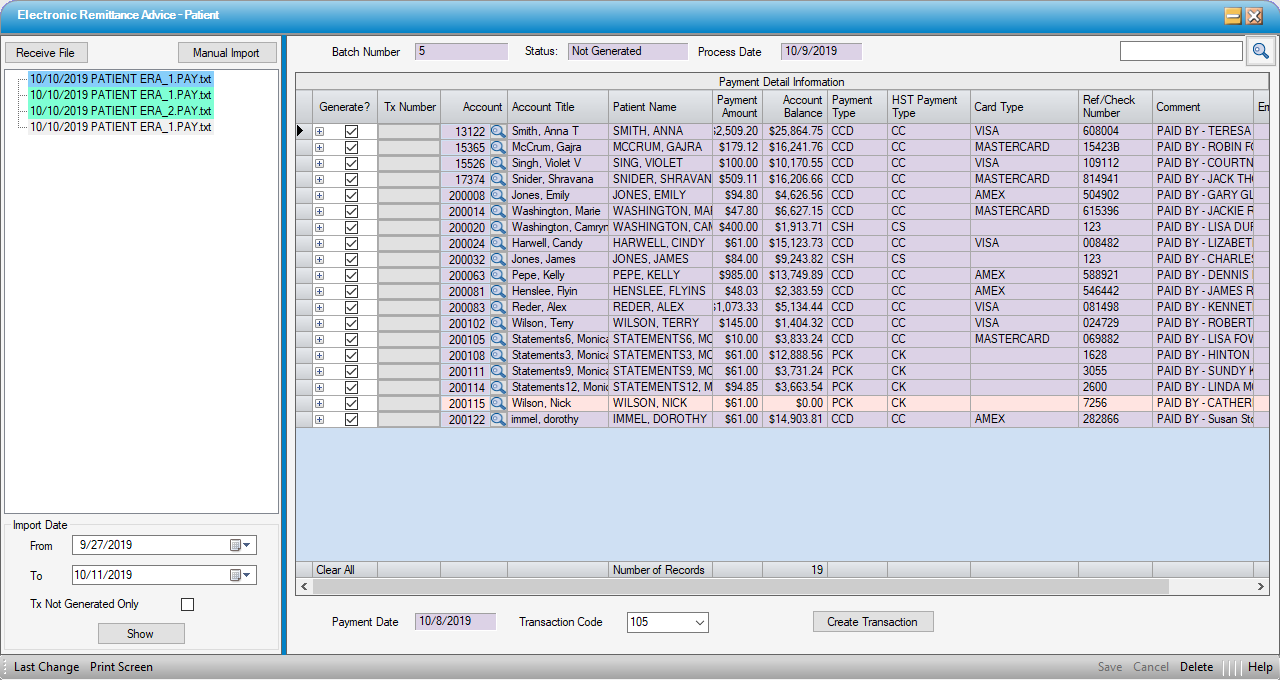 This selection will only be activated and visible in the Billing menu for those centers that are contracted with both HST Practice Management and Waystar for this function. (If other clearinghouses can produce an 835 patient ERA in the correct format, then it may be made available for Manual Import as well.)