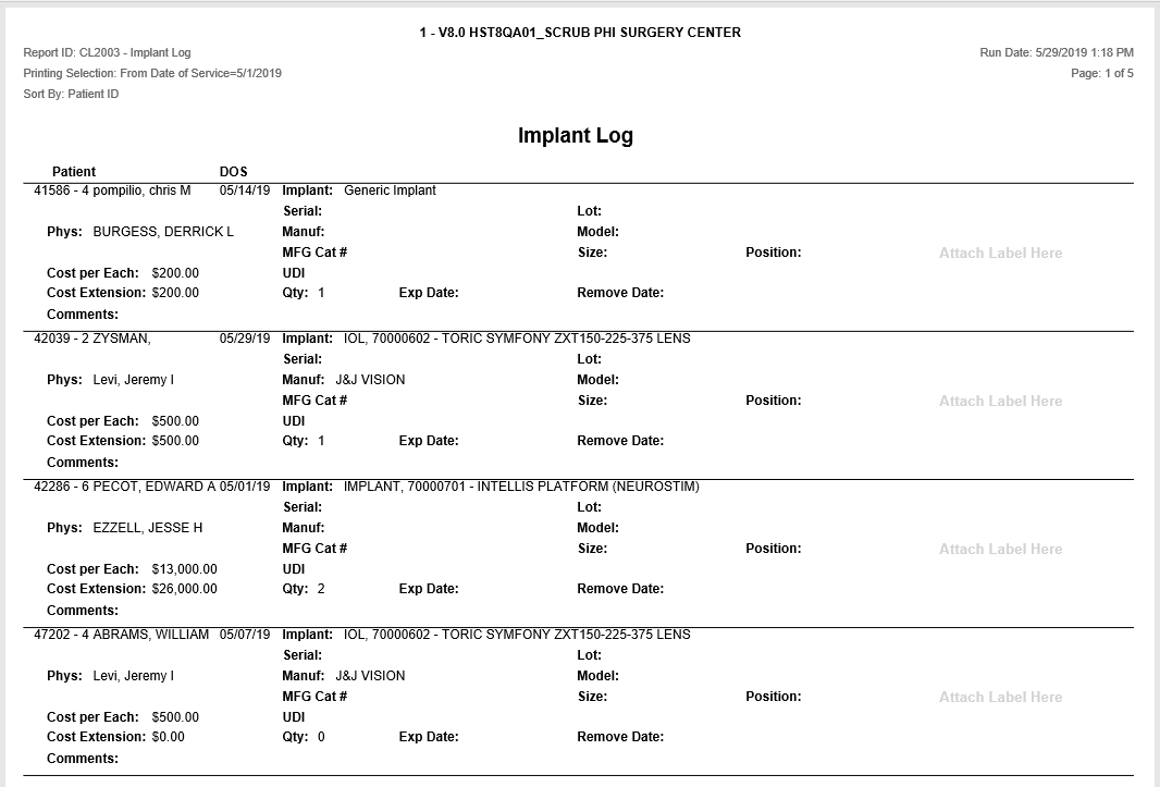 Provides full detail for each implant entered in Case History, Implant Log, for all cases within the specified inclusion criteria.  There’s a marked location on the report to attach a label.