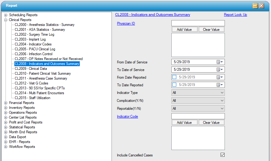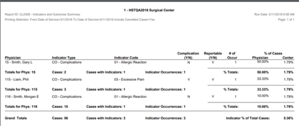 Run the report based on selected Physician ID(s), by date of service range or date(s) reported, individual Indicator Type, by complication flag (yes or no), reportable flag (yes or no), or by selected Indicator Code(s).