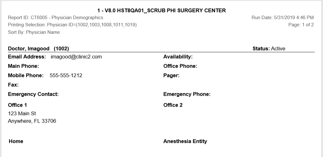 The Physician Demographics report displays detailed contact information entered into the Physician Profile area for specified physician(s) and their specialty.