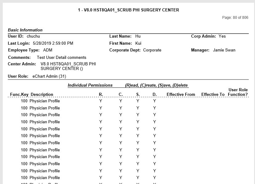 Detailed user permissions information.  Reads directly from Administration, User Permission, User Profile.  A new page will print for each user name.