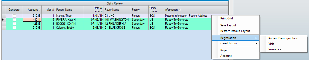 • If errors are found when the claims are scrubbed, the line item will be grey and a warning message will appear in the Information column indicating why the claim was rejected. In addition, the check box in the Generate column will be unchecked.