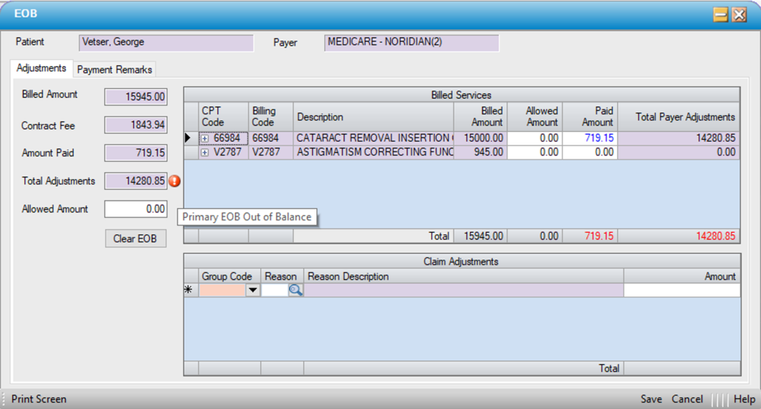 Enter the payment and adjustments for the 66984 line item only. The error ball will indicate that the primary EOB is out of balance, because Paid Amount and Total Payer Adjustments do not balance to the total Billed Amount of $15,945.00. They do, however, balance to the Billed Amount of $15,000.00 that will be transmitted on the secondary claim.