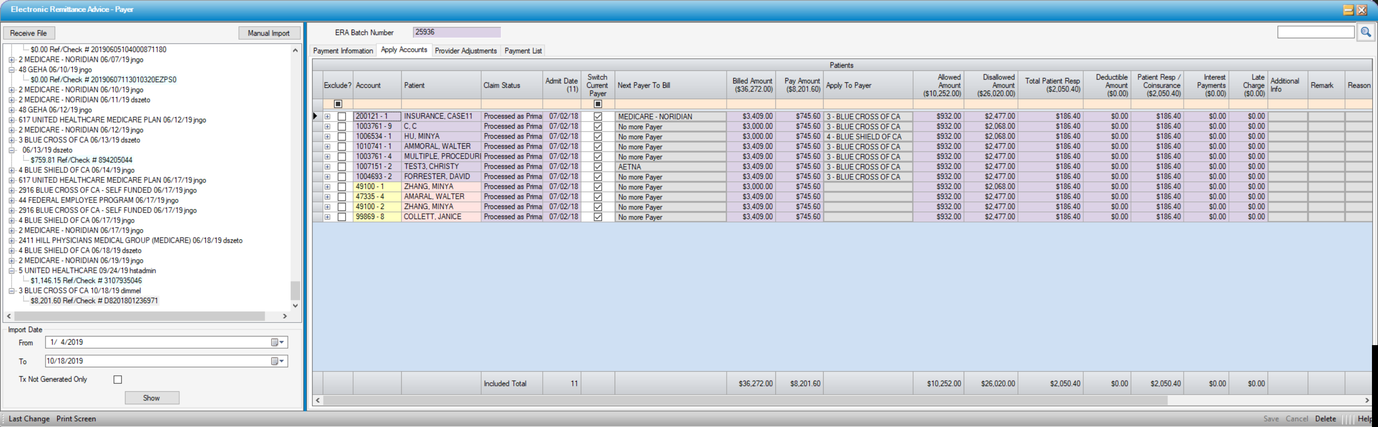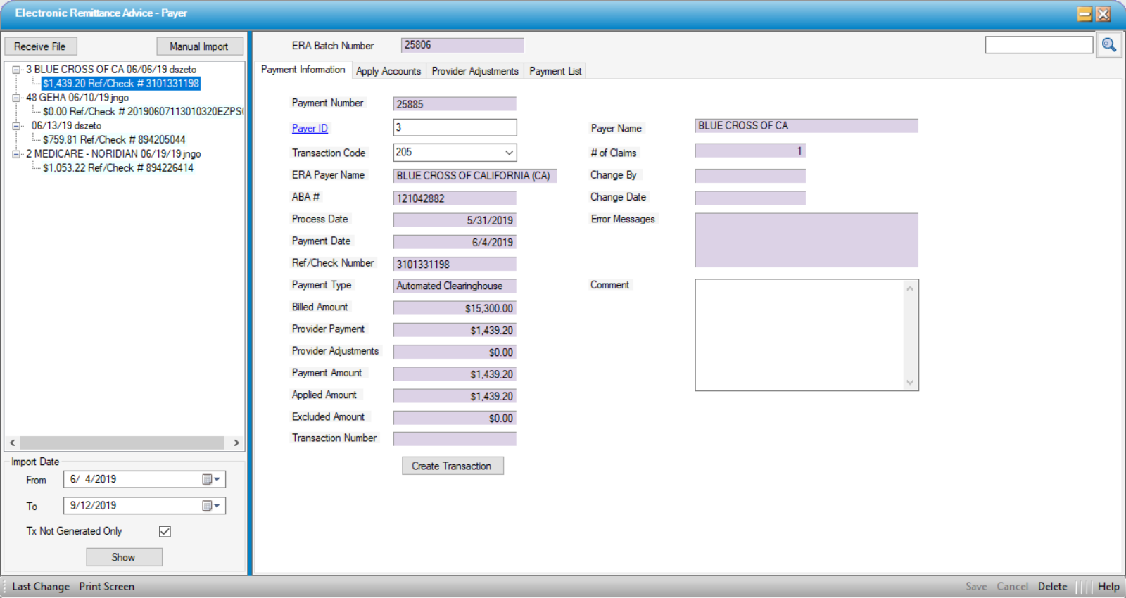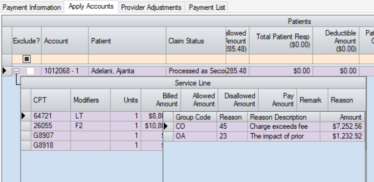 Once the file(s) has been imported double click on a child node to review the remittance. This will populate the Payment Information, Apply Accounts, and Provider Adjustments tabs.