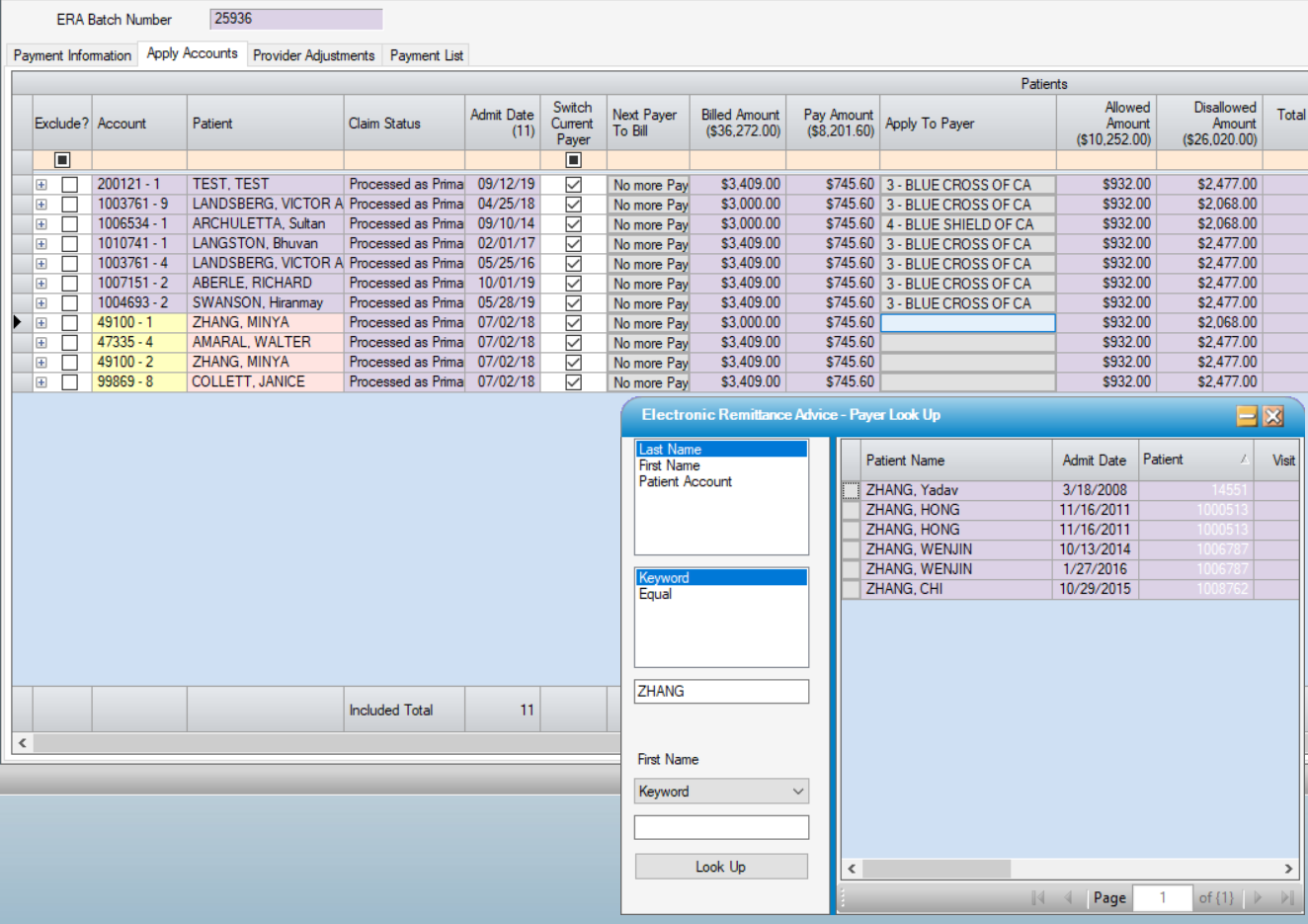 Grid Search: The top (blank) line allows users to search individual patients by account number, patient name, admit date, payer, and amount types.