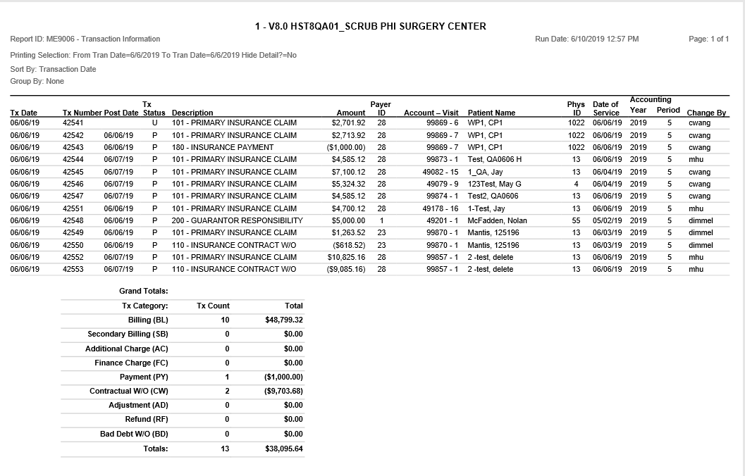 • Results can be grouped by Transaction Date, Date of Service, Payer ID, Physician ID, Transaction Code, Transaction Category and Change By user.