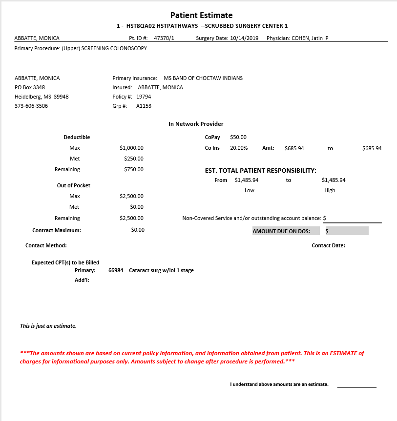 Provides the patients Network Information and an estimation of what the patient has to pay. See Patient Estimator for detailed information.