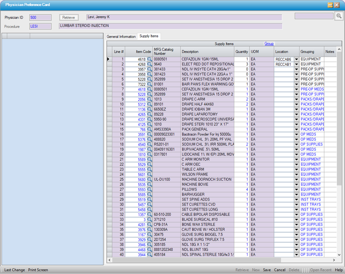 • Select the Locationand Grouping from the drop down. Inventory Location and Physician Pref Card Group are both found under Center Tables in Administration > Code Table Maintenance. These tables are built and maintained by the center. Preference Cards can be printed by Item Location or Pref Card Group for ease of pulling supplies. Supply Used can be grouped if staff is responsible for updating supplies used in specific departments/areas.
