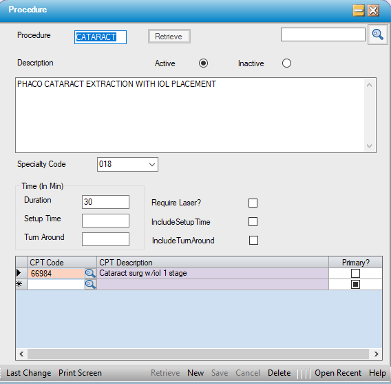 - The status will default to Active. (Inactive Procedures will not display in the Procedure look up.)