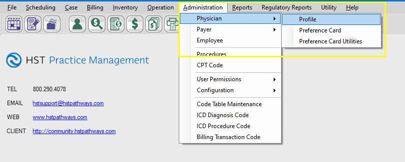 In the image below, we are selecting to work in Administration, and open the Physician Profile form.