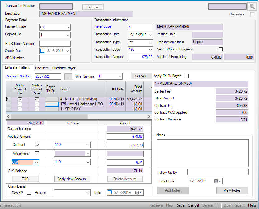 In the Payments and Adjustments form, enter the Transaction Information for the primary payer, then enter the patient account number and select the appropriate visit. Enter the primary payment in the Applied Amount field. (This can be $0.00 if the primary allowable was applied to the patient's deductible.) Enter Contract Write Off if not applied at time of Charge Entry.