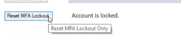 This button is only enabled if Multi-Factor Authentication (MFA) is enabled at a center this user has access to and their account is locked. When an account is not locked, the following message will display next to the button: User is not locked out. When the account is locked the message next to the button displays: Account is locked. When this button is clicked, the account is reset and the message will display The Account has been reset. This option can be accessed by those users who have permission to Reset Passwords. The hover message for this button reads Reset MFA Lockout Only. This option does not affect user passwords.