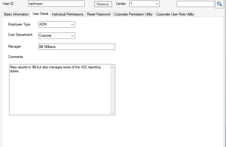 The User Detail tab includes fields to further classify users accessing the system, as well as a comment field for additional notes relevant to access or duties.