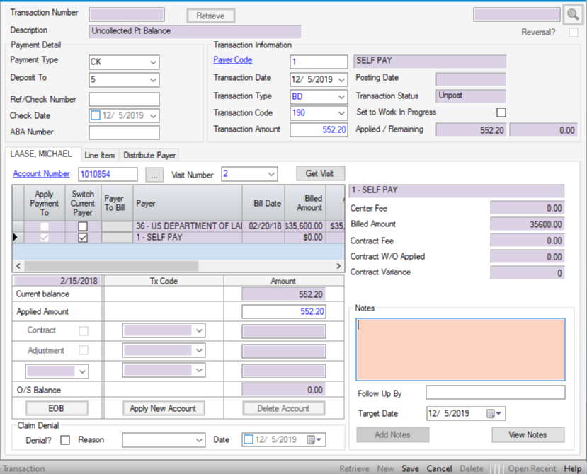 function key to enter the next Account Number, Visit, and Applied Amount. Status will be set to Work In Progress until total Applied Amounts = the Transaction Amount, at which time the transaction can be saved and posted. -