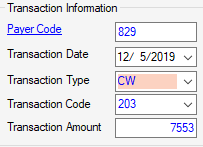 - Transaction Type will default to PY - Payment. Enter CW or select from drop down.