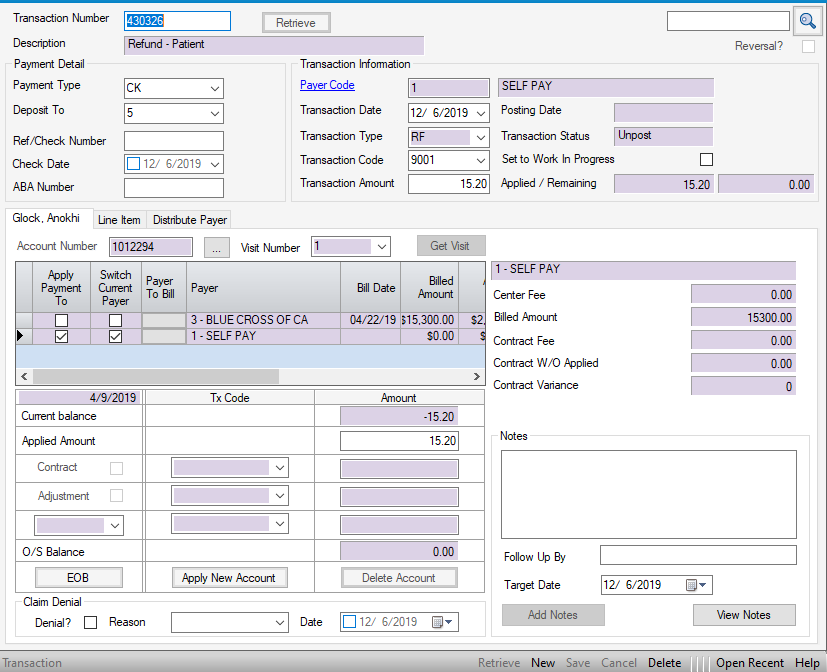 Patient Refunds can also be entered using Bulk Self Pay Transactions. Insurance Refunds must be processed via the Payments And Adjustments form.